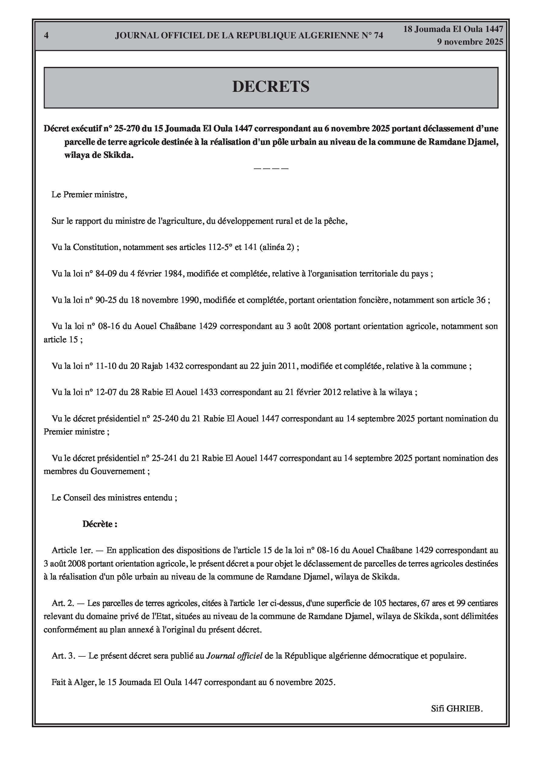 Le gouvernement approuve le déclassement de plus de 105 hectares de terres agricoles dans la commune de Ramdane Djamel, Skikda, pour la création d'un nouveau pôle urbain.