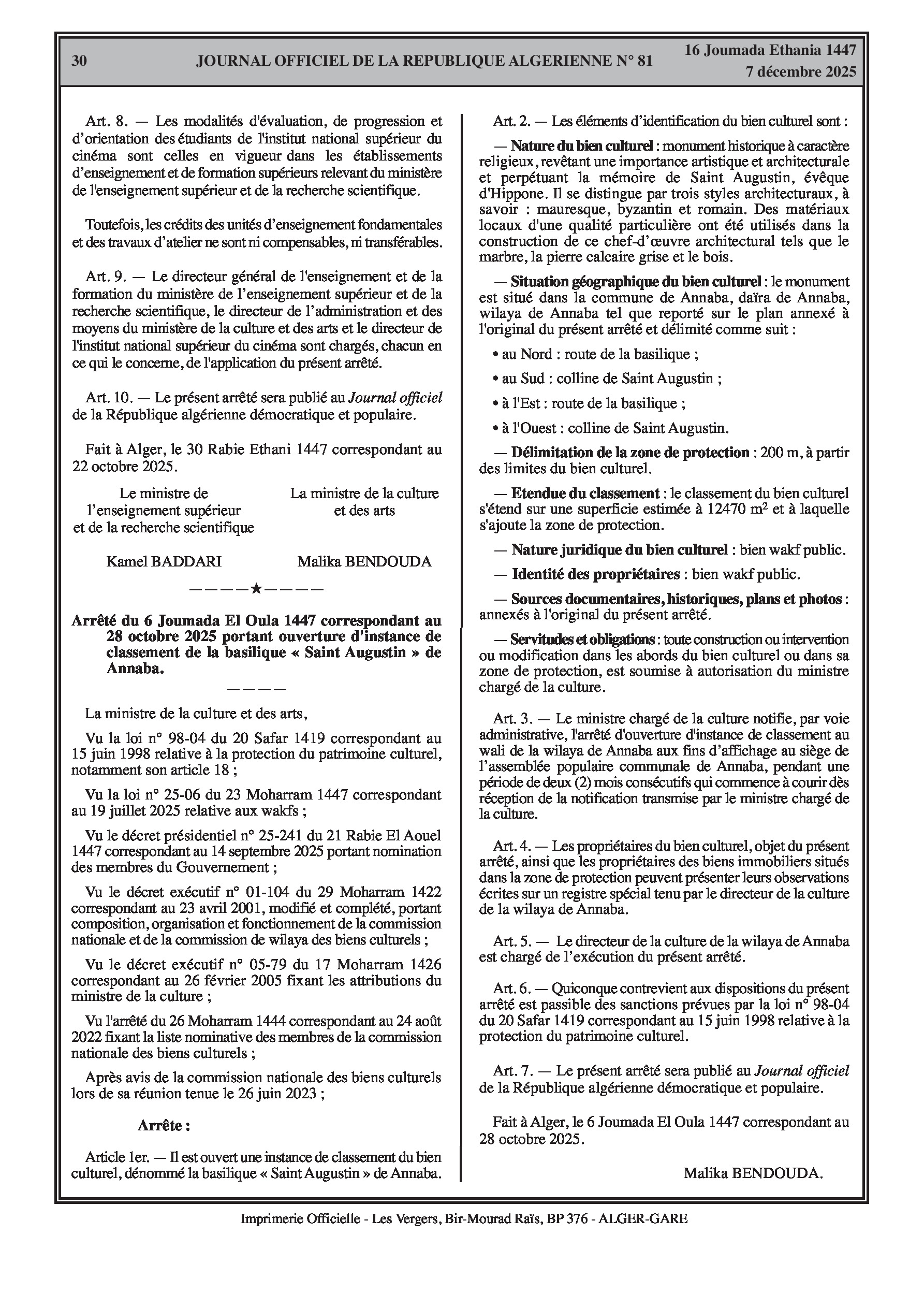 Ouverture de la filière "Arts visuels" (cinéma) à l'INSC ; ouverture d'instance de classement de la Basilique "Saint Augustin" d'Annaba comme bien culturel wakf public.