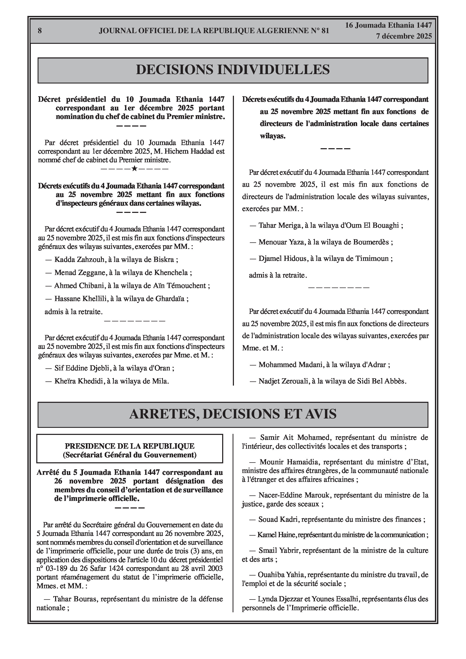 Nomination de Hichem Haddad comme chef de cabinet du Premier ministre ; désignation de centaines d'assesseurs militaires et fin de fonctions d'inspecteurs et directeurs locaux.
